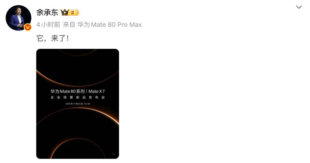 11月17日消息,今日,华为官宣于11月25日14:30分举行新品发布会,届时将发布华为Mate 80系列、Mate X7及多款全场景新品。 华为常务董事、产品投资委员会主任及终端BG董事长余承东在社交平台发布动态称:“它,来了!”,该条动态的机型水印显示为华为Mate 80 Pro Max。